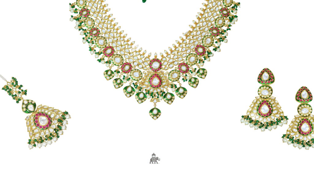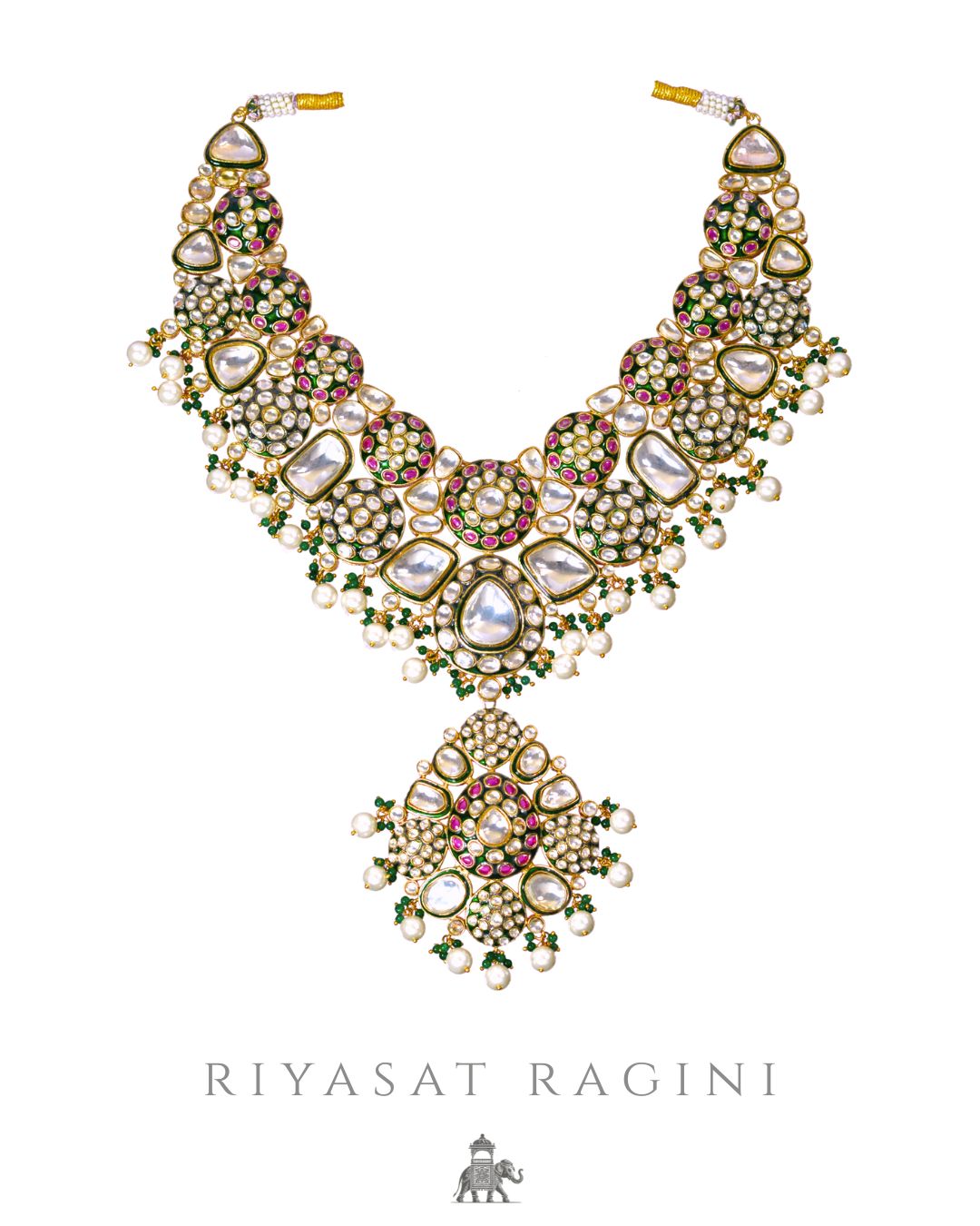 Riyasat Ragini is a Polki masterpiece that showcases the finesse of traditional karigari. Hand-set uncut Polki diamonds are crafted in classic kundan technique, allowing each stone to retain its natural glow. Detailed enamel work, delicate pearl accents, and thoughtfully layered motifs come together to create a design that feels rich yet balanced. Designed as an heirloom, Riyasat Ragini reflects timeless craftsmanship for the modern bride who values heritage and refinement.