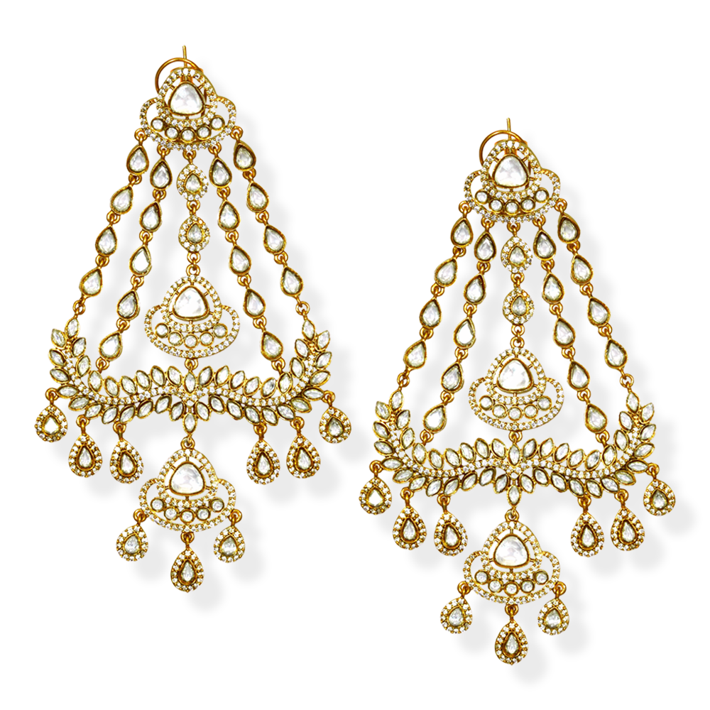 These earrings are an opulent pair of traditional Kundan chandelier-style chandbalis. Crafted with a gold-tone framework, they feature multiple cascading tiers of pear-shaped and round uncut-style stones, giving them a regal and intricate look. The design includes elegant dangling drops, ornate floral motifs, and layered arches that create a rich, statement-making silhouette. Perfect for weddings, festive occasions, and bridal wear, these earrings showcase classic Indian craftsmanship with a luxurious finish.